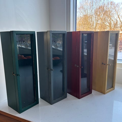 Säljer två matchande smala dörrar med glas, i trä, målade i vit/shabby chic-stil. Perfekta som vitrindörrar till skåp, innerdörrar till platsbyggd förvaring, rumsavdelare, dekoration eller till projekt inom inredning, butik, scenografi eller DIY.
