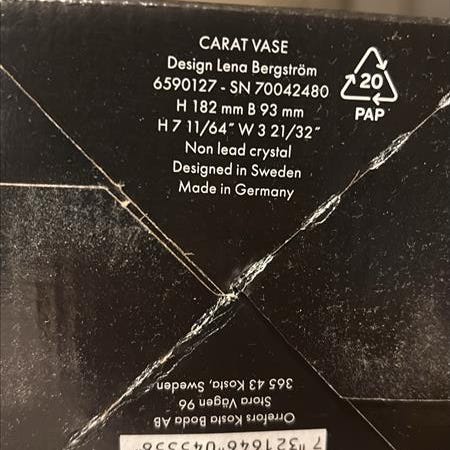 Vas 15 cm hög, aldrig använd, den har legat i sin kartong i många år.