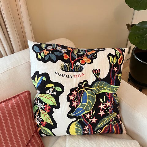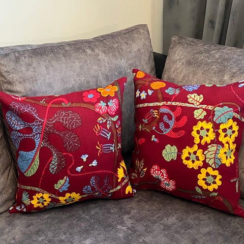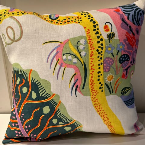 En stor kudde med tyg från Josef Frank/ svenskt tenn. Svart med färgglatt mönster. Kudden är egensydd och innehåller en dunkudde som ingår.