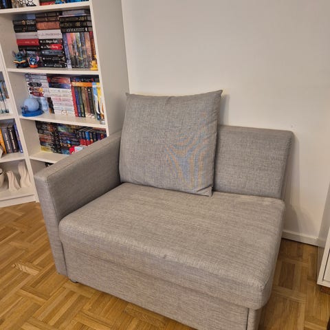 En bekväm fotölj som enkelt blir en säng! Den är knappt använd, vingar haft det som fotölj i i gästrum