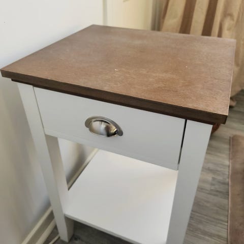 Grå sängbord i serien Hemnes från Ikea. De har fått lite märken i flytt (se bilderna, finns också en färgskråma ovanpå ett av dem som var svårt att få med på bild), i övrigt fint skick.