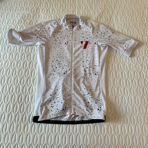 Void cykeltröja i svart färg med vitt mönster. Tröjan är designad för cykling och har korta ärmar. Material och storlek är ej angivna.