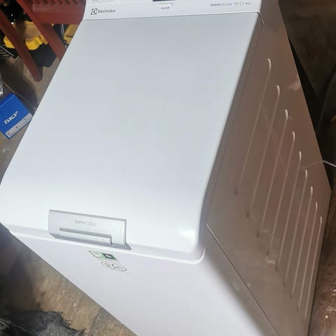 Liten skada på locket, påverkar ej tvättfunktion(se bild). Annars i fint skick och digital display för tider och program.