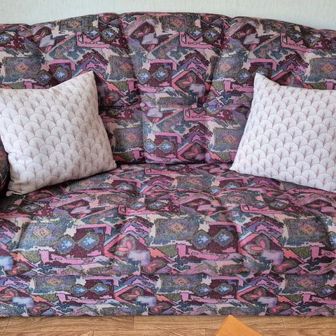Fin, smäcker, välskött soffgrupp med tresitsig soffa och fotölj. Mönstrat tyg med rosa basfärg.