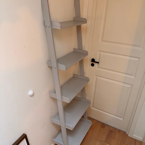 Svart steghylla / bokhylla som lutas mot vägg.