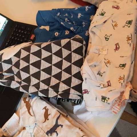 Ett blandat set med babykläder storlek 62. Inkluderar pyjamas med mönster, bodies, byxor och en badbyxa. En ärmlös tröja med Bamse motiv finns också.