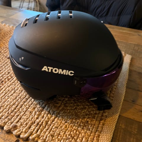 Atomic skidhjälm med integrerat visir i svart färg. Hjälmen är designad för att skydda huvudet vid skidåkning och har ett inbyggt visir med spegeleffekt som skyddar ögonen mot sol och vind.