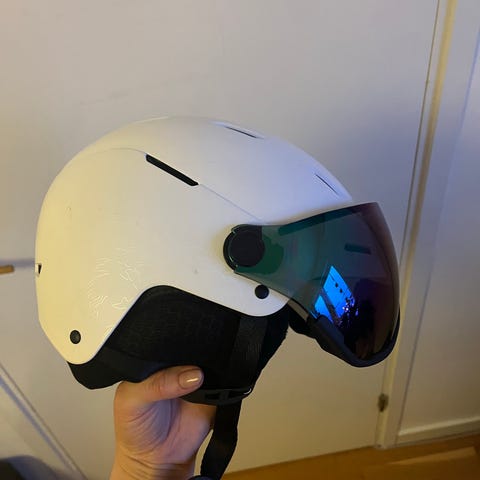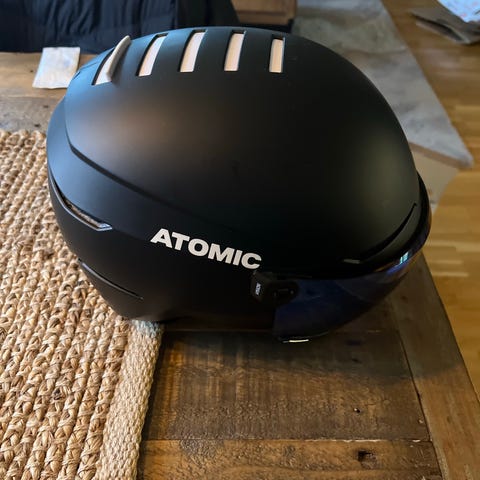 Atomic skid- och snowboardhjälm i svart färg med inbyggd visir. Hjälmen är designad för att ge skydd vid vintersportaktiviteter och har ventilationsöppningar för luftcirkulation. Insidan är vadderad för komfort och säker passform. Hjälmen är justerbar med spänne under hakan och har en slitagemärke på baksidan.