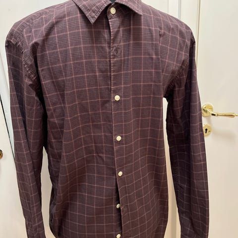 Gul-vit rutig skjorta med korta ärmar och en bröstficka. Skjortan har en knappslå framtill och en liten logotyp tryckt på sidan. Observera revan vid en av knapparna. Sitter tight .Galge ingår ej.Nypris 899 kr.