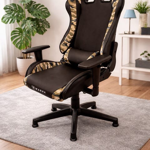 Bekväm gamingstol med stödjande tygkuddar och spak för att ställa in bekväm lutning.
