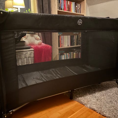 Carena Långholmen resesäng i grå färg. Sängen är avsedd för barn och är lätt att ta med vid resor. Den har en mjuk madrass och nätväggar för god ventilation och insyn.