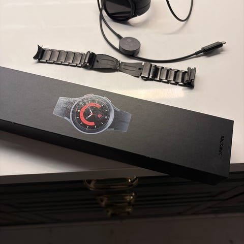 Samsung smartklocka i svart färg. Klockan fungerar utan problem och visar vissa ytliga repor på skärmen. Laddare ingår.