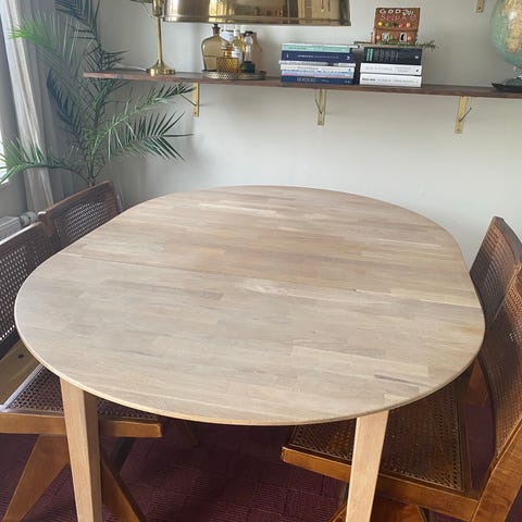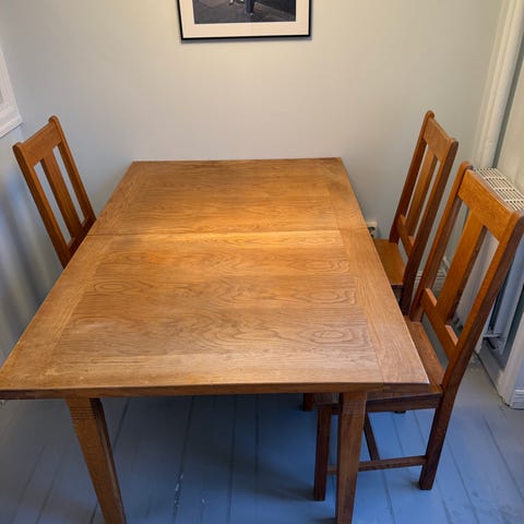 Det är ek i stommen och ekfane’r på ytan. Mycket bra skick. Säljes utan stolar.