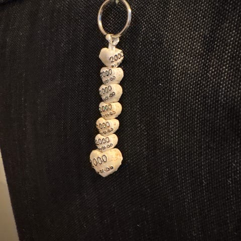Polmården nyckelring med en liten flaska innesluten i klar plast. Nyckelringen är avsedd för att fästa nycklar och har en metallring och krok för enkel användning.
