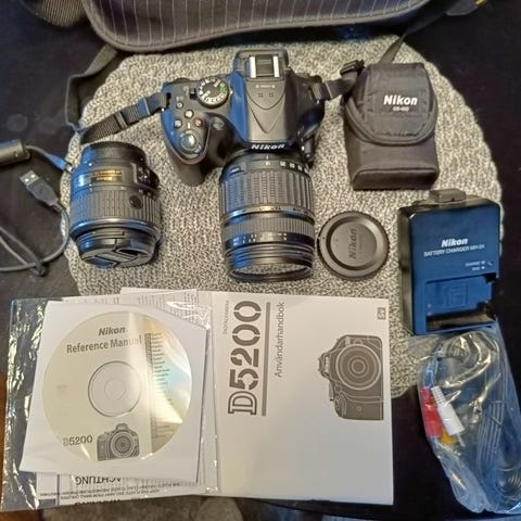 Nikon D60 kamerahus, Nikon AF-S Nikkor 18-55mm 1:3,5-5,6G, AF-S Nikkor 55-200mm 1:4-5,6G, UV-filter på båda objektiven, Blixt Nikon SB-400, laddare original, minneskort, instruktionsböcker. Perfekt digitalkamera att börja med. Mycket sparsamt använd.