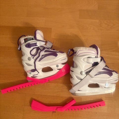 Justerbara barnskridskor i storleken 31-34, märke Graf Thinsulate. De är i bra skick men har synliga namnmärkningar, se bild 3.