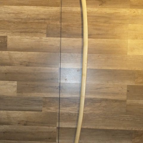 Stark, bred, kompakt långbåge i D-profil gjord av alm. Utmätt till #61 @ 60 cm men drar längre (vill inte överspänna den). Hög träffsäkerhet och pilhastighet. Böjer sig jämnt genom hela kroppen och är lätt att dra om man har erfarenhet av bågskytte. Bågens form och tapering efterliknar engelska långbågar men dess breda armar och relativt korta längd gör att den känns lite som en recurve/flatbow. Materialet alm är känt för sin seghet, elasticitet och livslängd. Längs nockarna har jag lindat läder för att inte öglorna ska göra avtryck i träet.