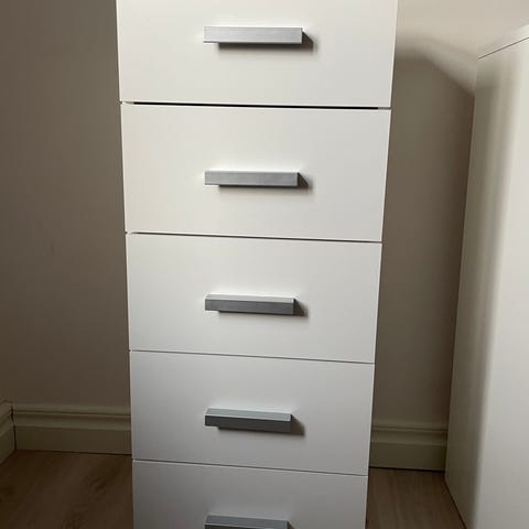 Säljer en stabil och praktisk byrå som är ca 10 år gammal. Den har tre rymliga lådor och gott om förvaringsutrymme. Stilren design i mörk träfinish med vita fronter och silverfärgade handtag.