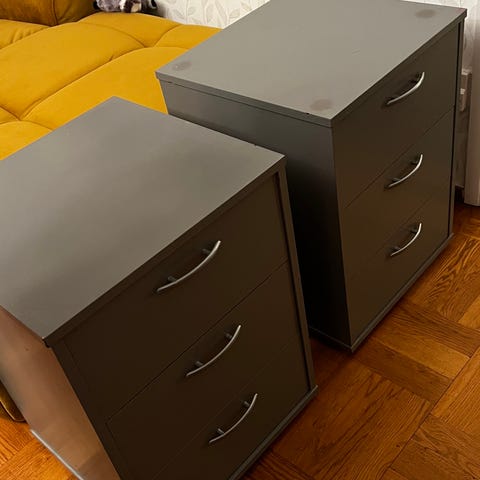 Nätt äldre byrå i ommålad trä. Svart med mässing handtag. Lite mindre i storleken men rymmer massor, passar fint som sängbord/ nattduksbord , i hallen eller som lampbord/ avlastningsbord vid soffan.