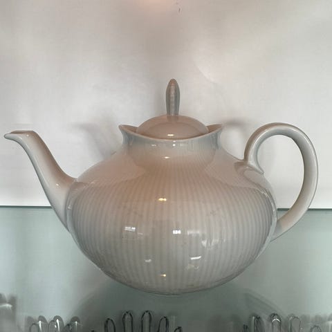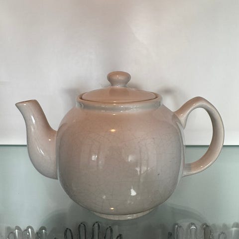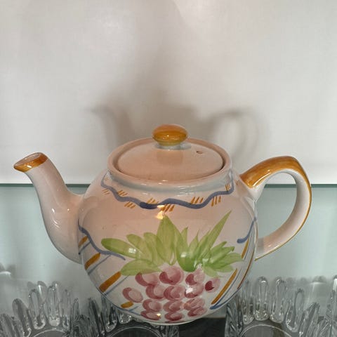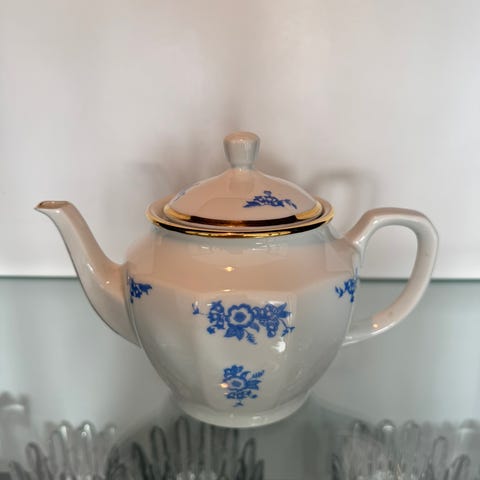 Tekannan har ett handtag i rostfritt stål och ett lock med dekorativt handtag.