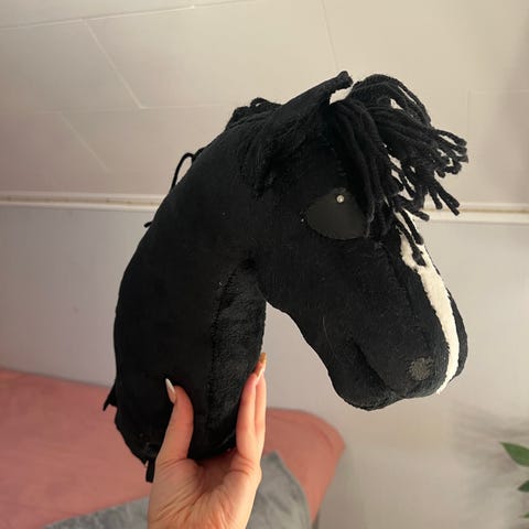 Disney Hästkäpp leksak i form av ett hästhuvud med brunt man och beige färg. Leksaken är avsedd för barn och används som en käpphäst för lek och rollspel.