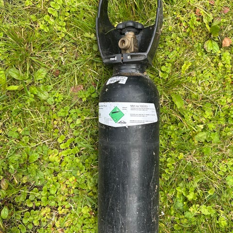 Gasflaska 5 L med 1,65 kg Argongas kvar. Använd till MIG-svetsning.