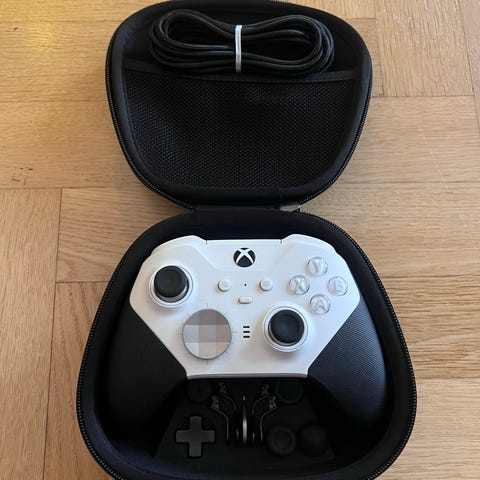 Xbox Elite Series 2 i blå färg. Kontrollern har utbytbara styrspakar och D-pad. Levereras i ett hårt skyddsfodral med förvaringsutrymme för tillbehör och laddningskabel.
