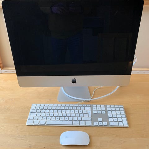 Apple iMac stationär dator i silverfärg. Komplett med trådlöst tangentbord och mus. Enheten är avsedd för allmän datoranvändning och har en skärm i integrerad design.