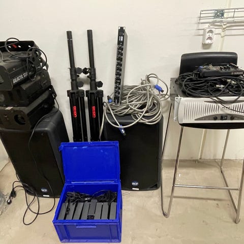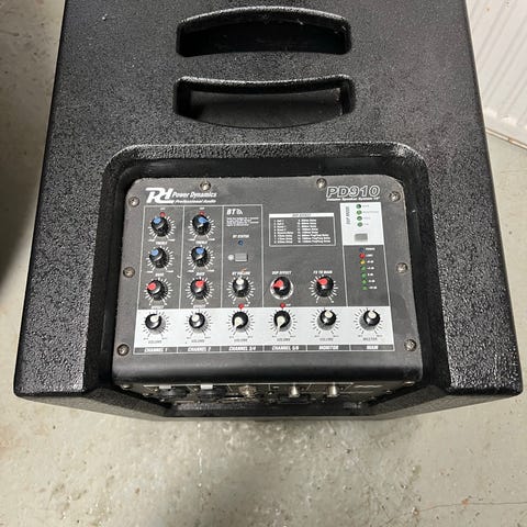 Äldre PA system, lite raspiga pottar men fungerar bra ljud, kan provas innan köp.