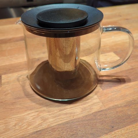 Kannan har en integrerad sil för teblad och är tillverkad i transparent glas.