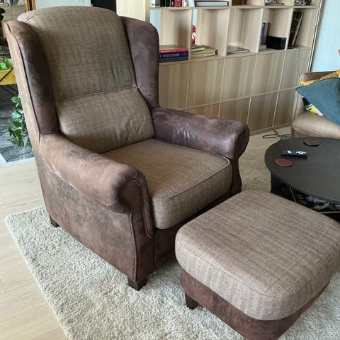 Finns att köpa 2 stycken 1000 kr styck, 2000 kr för båda! Mycket fin brun läder fotölj från Ikea. Går att snurra. Har även en inbyggd huvudkudde. Höjd på själva ryggstödet är 80cm, och höjd från sätet till marken är 32cm