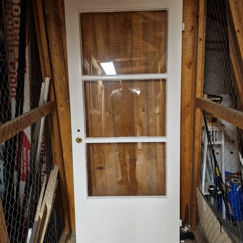Elegant innerdörr med vackert mönstrat glas och mörk träram. Ger rummet karaktär och ett exklusivt uttryck. Passar perfekt som dörr mellan rum eller som inredningsdetalj. Med karm. Har slipats inför oljning med ändrade planer.