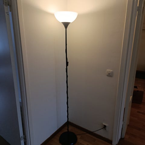 Golvlampa med svart metallstativ och vit skärm. Lampan har en lång, böjd design och en rund bas. Passar för allmän belysning i hemmet.