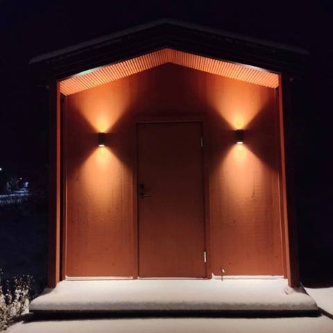 Isolerade väggar och tak. Fönster för naturligt ljusinsläpp och ventilation. Det får plats ca 4-5 personer. Man kan även sätta dit en till sittbänk om man vill, utrymme finns. Belysning finns både inne och ute.