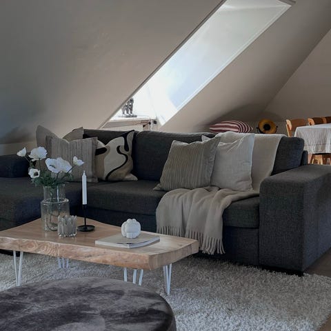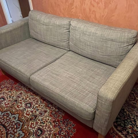 En ljusgrå soffa med schäslong 160 cm i använd skick, lätt att montera