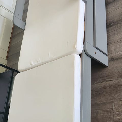 Mio säng med sänggavel i grått tyg med stoppad sänggavel och vit madrass. Sängen är enkel och har en neutral design som passar i olika sovrumsmiljöer.