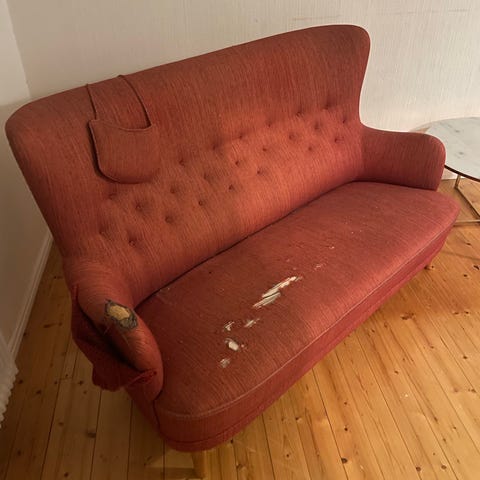 En klassisk soffa i gott skick som man kan använda som bäddsoffa om man lägger på en 80cm madrass. Väldigt fina dynor. Några skav på armstöd.