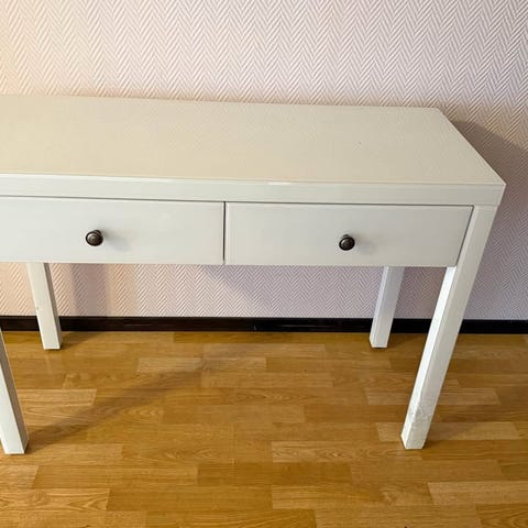 Sminkbord alt Hallmöbel i reliefskuret mönster i svart trä och botten i spegelglas . 2 hyllplan inne i varje skåp och 3 lådor upptill . Bredd 140 ,djup 30,höjd 72 ,Spegel höjd : 100xbredd120'