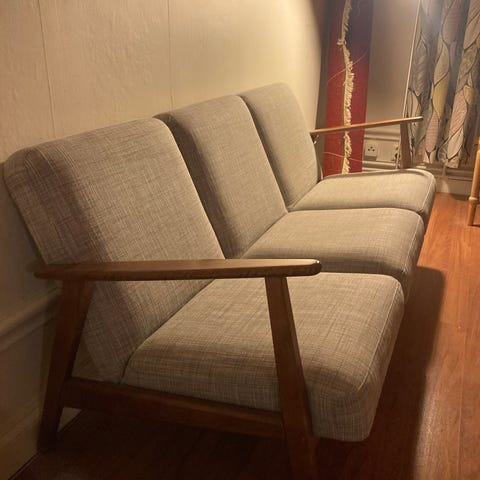 Grå soffa med armstöd i trä