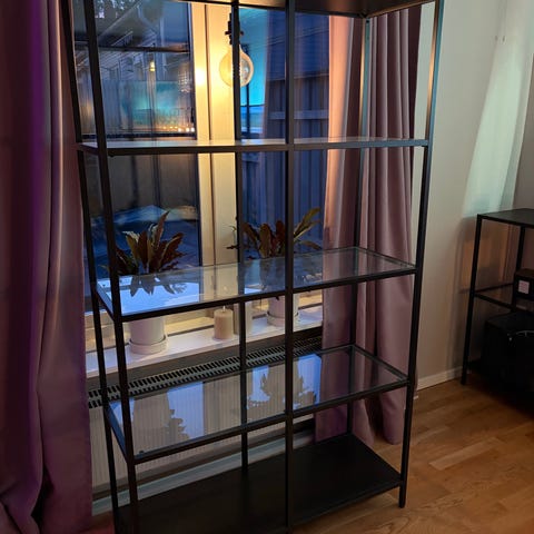Säljer en modern hylla med svart metallram och hyllplan i glas. Passar perfekt som bokhylla, vitrinhylla eller för förvaring/dekoration i vardagsrum, kontor eller hobbyrum.
