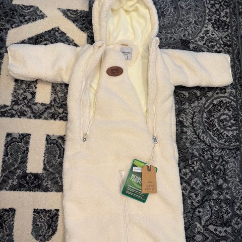 Fin och ren åkpåse (Teddy och fleece fodrad) som passar kärra och finns förberett för sele, tyvärr fattas det en knapp längs ner, använd av ett barn några månader.