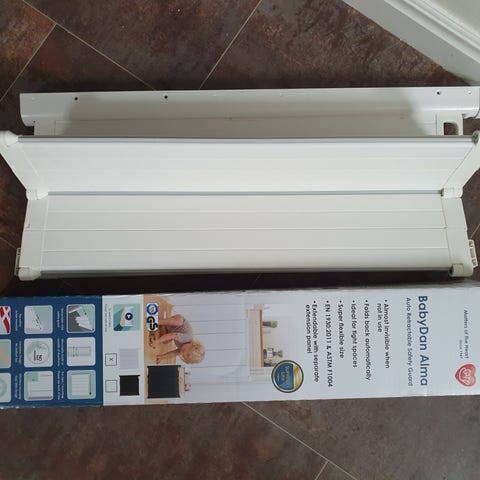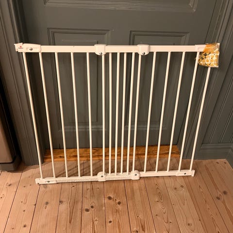 BabyDan KiddyGuard Avant barnsäkerhetsgrind i vit färg. Produkten är avsedd för att användas som säkerhetsgrind för barn och kan monteras på trappor eller dörröppningar. Grinden är tillverkad av material som är anpassade för säker användning i hemmet och har funktioner för enkel öppning och stängning. Passar för upp till 130cm trapp/dörröppningar.
