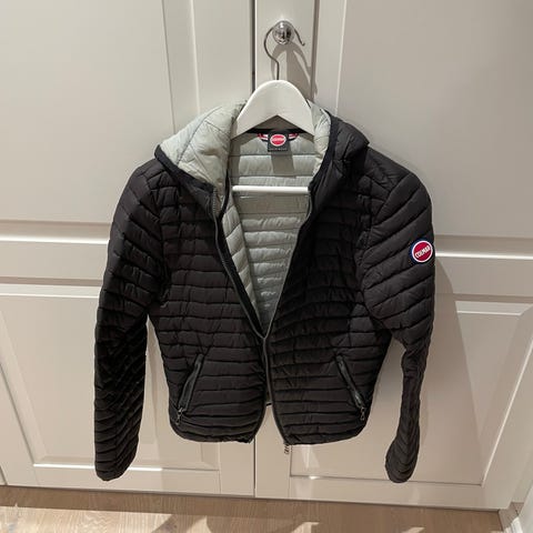 Colmar jacka i dun för herrar, storlek 48. Jackan är blå och tillverkad av dunmaterial, vilket ger isolering och värme. Passar för utomhusbruk och kallare väder.