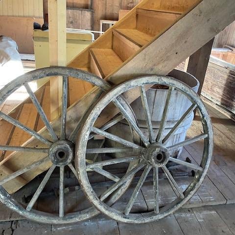 Vagnshjul I trä med metallnav ett par , rund form med flera ekrar, använd för exempelvis vagnar eller som dekorativt föremål. Hjulet är av trä med metallkomponent i navet.