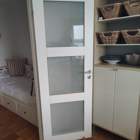 Säljer en innerdörr (massiv) med karm med handtag som är använd som bygg dörr.