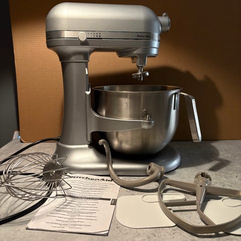 Maskinen är komplett med samtliga originaltillbehör, inklusive praktisk tillbehörsbox för skivor och knivar. Kraftfull, stabil och perfekt för allt från hackning och rivning till deg.