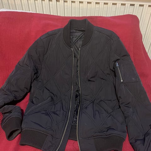 Marinblå regnjacka med huva och tryckknappar. Jackan har två fickor fram och har aldrig anvendas. Storleken är M men det är snarare en L.