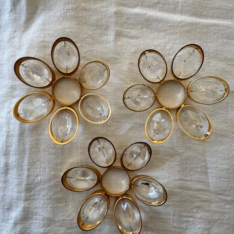 12 st ljuvligt söta servettringar och två matchande ljusmanschetter i beige/offwhite. Fint hantverk! De lyfter vilken dukning som helst. Hela men små fläckar och märken förekommer. Se bilder. Hör av dig om du har frågor. Ljus, ljusstake och servetter ingår ej. Jag packar väl men ansvarar inte för transportörens slarv. Se gärna mina övriga annonser.