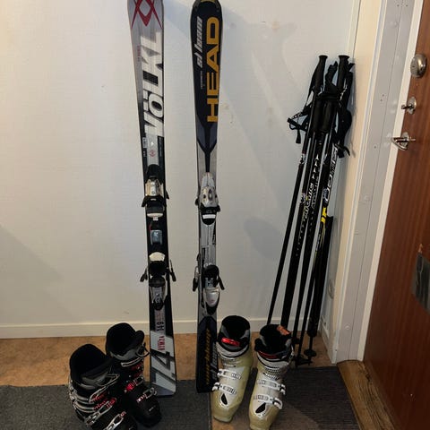 Ficher Sl skidor längd 140 cm. Är ett märke på obansidan. Belagen är bra och det är ca 65% kant kvar pris 1500 kr