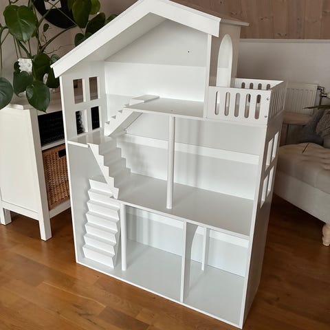 Jox Stockholm Dockhus/bokhyla i trä med flera rum och möbler i olika färger. Dockhuset har en vit grundfärg och inkluderar möbler som köksbord, stolar, sängar, soffor och andra inredningsdetaljer. Passar för barn och kan användas för lek och inredningsaktiviteter.